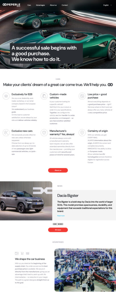 Wholesale online dealer of passenger cars. One pager web for European market.